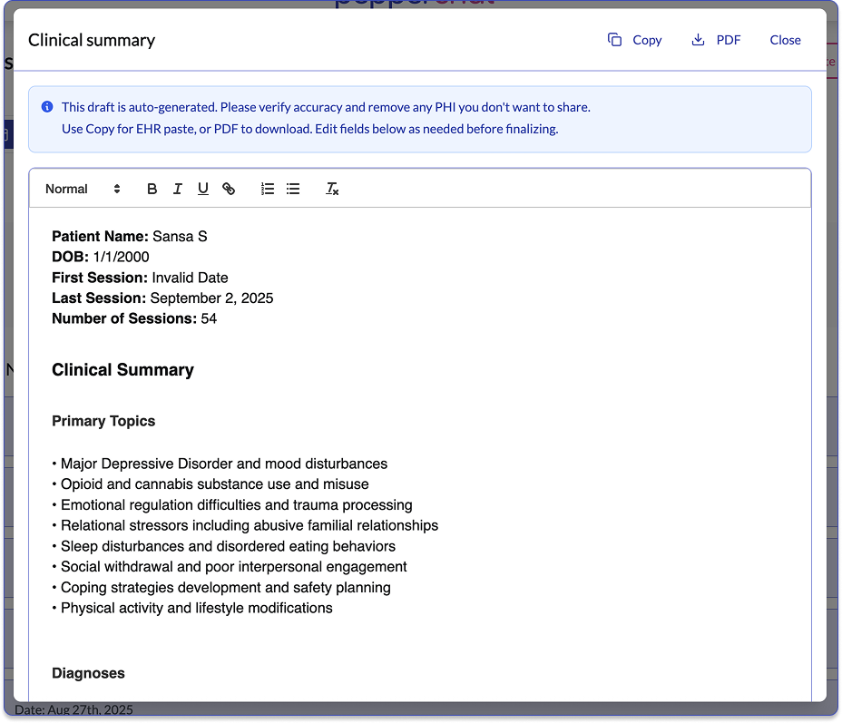 Why dig through old notes when we can do it for you? PepperChat securely analyzes progress notes and treatment plans to produce a concise clinical summary. You review, refine, and share.